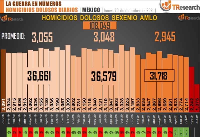 El reporte ‘MX: La Guerra en Números’, de T-ResearchMX, detalla que, de acuerdo con el registro de homicidios dolosos de la Secretaría de Seguridad y Protección Ciudadana, del 1 de diciembre de 2018 al 19 de diciembre de 2021, tiempo que lleva la actual Administración del presidente Andrés Manuel López Obrador, las fiscalías estatales y federales han registrado 108 mil 49 homicidios dolosos en México.