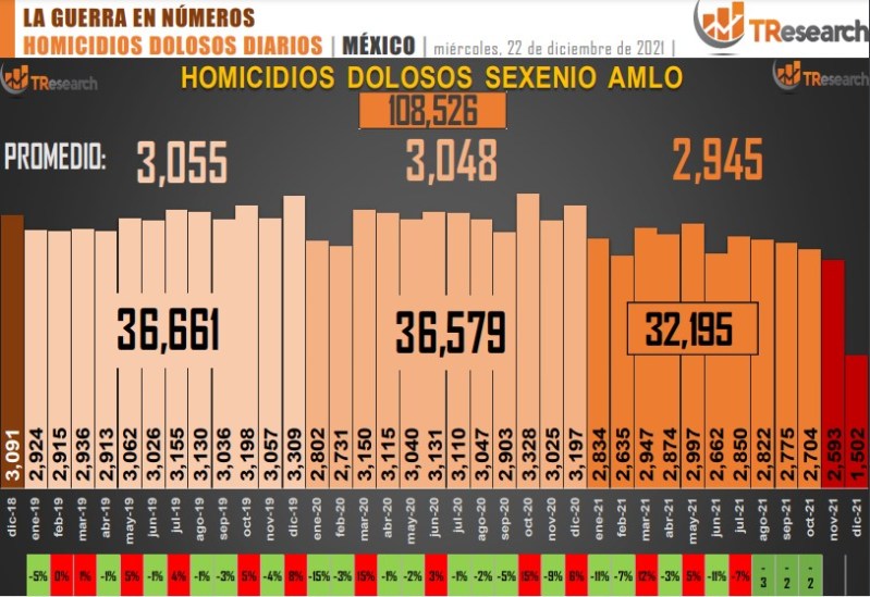 El reporte ‘MX: La Guerra en Números’, de T-ResearchMX, detalla que, de acuerdo con el registro de homicidios dolosos de la Secretaría de Seguridad y Protección Ciudadana, del 1 de diciembre de 2018 al 21 de diciembre de 2021, tiempo que lleva la actual Administración del presidente Andrés Manuel López Obrador, las fiscalías estatales y federales han registrado 108 mil 526 homicidios dolosos en México.