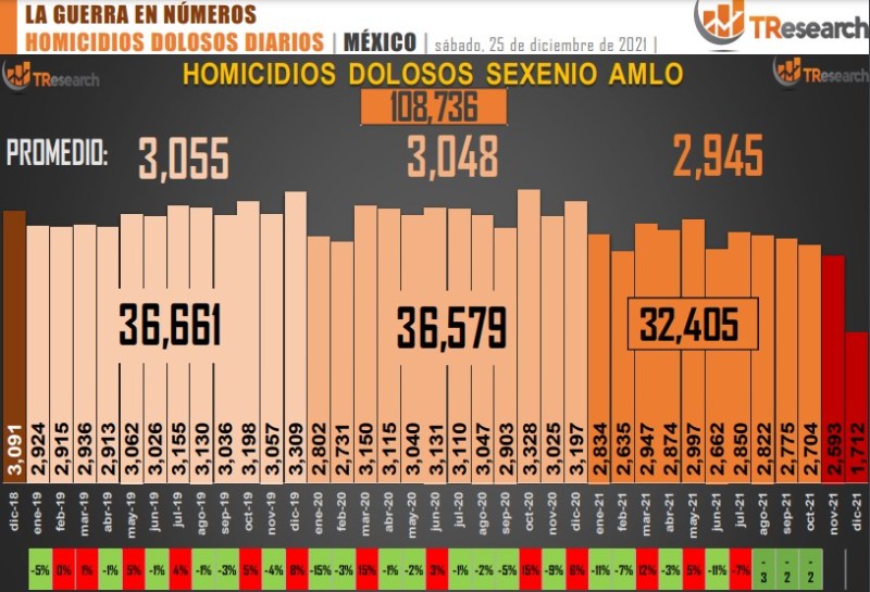 El reporte ‘MX: La Guerra en Números’, de T-ResearchMX, detalla que, de acuerdo con el registro de homicidios dolosos de la Secretaría de Seguridad y Protección Ciudadana, del 1 de diciembre de 2018 al 24 de diciembre de 2021, tiempo que lleva la actual Administración del presidente Andrés Manuel López Obrador, las fiscalías estatales y federales han registrado 108 mil 736 homicidios dolosos en México.