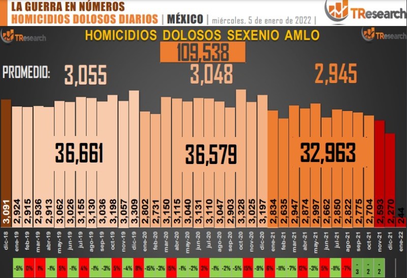 El reporte ‘MX: La Guerra en Números’, de T-ResearchMX, detalla que, de acuerdo con el registro de homicidios dolosos de la Secretaría de Seguridad y Protección Ciudadana, del 1 de diciembre de 2018 al 4 de enero de 2022, tiempo que lleva la actual Administración del presidente Andrés Manuel López Obrador, las fiscalías estatales y federales han registrado 109 mil 538 homicidios dolosos en México.