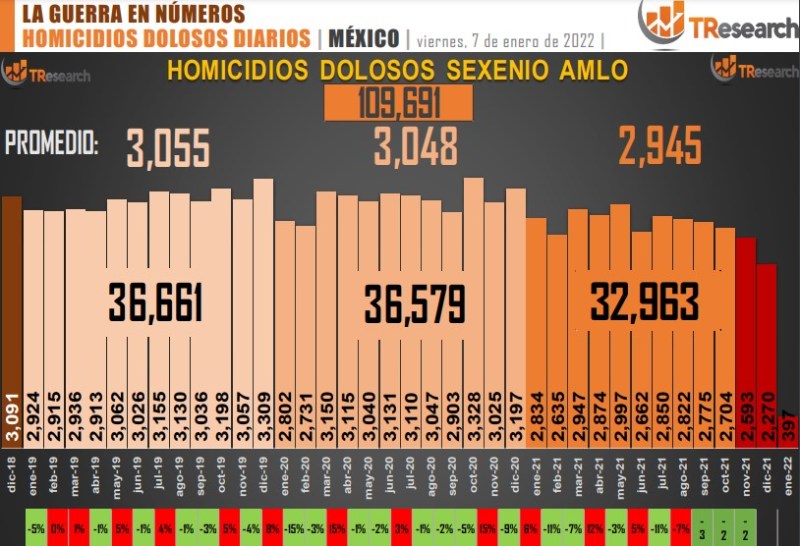 El reporte ‘MX: La Guerra en Números’, de T-ResearchMX, detalla que, de acuerdo con el registro de homicidios dolosos de la Secretaría de Seguridad y Protección Ciudadana, del 1 de diciembre de 2018 al 6 de enero de 2022, tiempo que lleva la actual Administración del presidente Andrés Manuel López Obrador, las fiscalías estatales y federales han registrado 109 mil 691 homicidios dolosos en México.