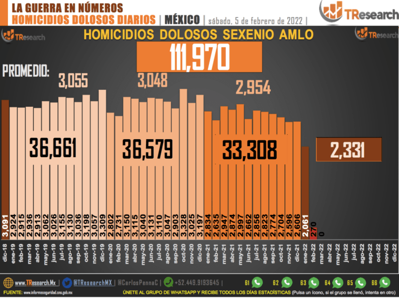 El reporte ‘MX: La Guerra en Números’, de T-ResearchMX, detalla que, de acuerdo con el registro de homicidios dolosos de la Secretaría de Seguridad y Protección Ciudadana, del 1 de diciembre de 2018 al 5 de febrero de 2022, tiempo que lleva la actual Administración del presidente Andrés Manuel López Obrador, las fiscalías estatales y federales han registrado 111 mil 970 homicidios dolosos en México.