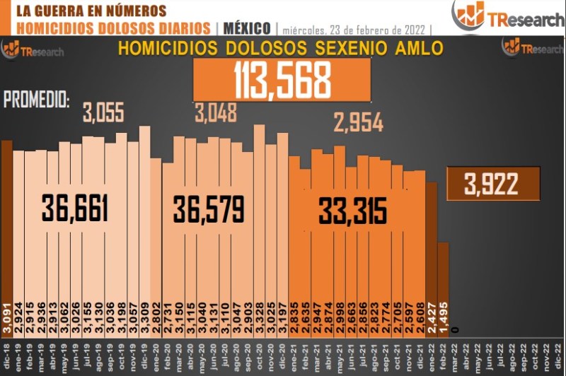 El reporte ‘MX: La Guerra en Números’, de T-ResearchMX, detalla que, de acuerdo con el registro de homicidios dolosos de la Secretaría de Seguridad y Protección Ciudadana, del 1 de diciembre de 2018 al 22 de febrero de 2022, tiempo que lleva la actual Administración del presidente Andrés Manuel López Obrador, las fiscalías estatales y federales han registrado 113 mil 568 homicidios dolosos en México.