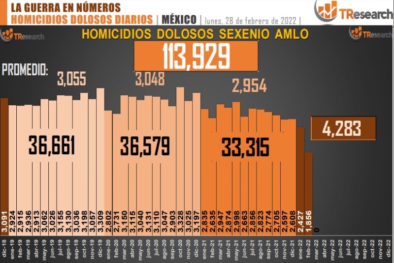 El reporte ‘MX: La Guerra en Números’, de T-ResearchMX, detalla que, de acuerdo con el registro de homicidios dolosos de la Secretaría de Seguridad y Protección Ciudadana, del 1 de diciembre de 2018 al 27 de febrero de 2022, tiempo que lleva la actual Administración del presidente Andrés Manuel López Obrador, las fiscalías estatales y federales han registrado 113 mil 929 homicidios dolosos en México.