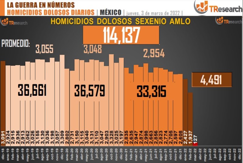 El reporte ‘MX: La Guerra en Números’, de T-ResearchMX, detalla que, de acuerdo con el registro de homicidios dolosos de la Secretaría de Seguridad y Protección Ciudadana, del 1 de diciembre de 2018 al 2 de marzo de 2022, tiempo que lleva la actual Administración del presidente Andrés Manuel López Obrador, las fiscalías estatales y federales han registrado 114 mil 137 homicidios dolosos en México.