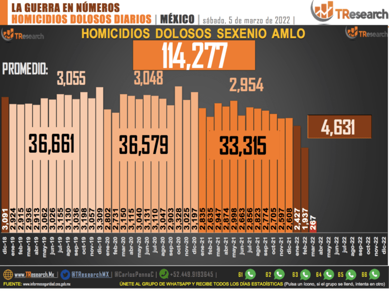 El reporte ‘MX: La Guerra en Números’, de T-ResearchMX, detalla que, de acuerdo con el registro de homicidios dolosos de la Secretaría de Seguridad y Protección Ciudadana, del 1 de diciembre de 2018 al 5 de marzo de 2022, tiempo que lleva la actual Administración del presidente Andrés Manuel López Obrador, las fiscalías estatales y federales han registrado 114 mil 277 homicidios dolosos en México.