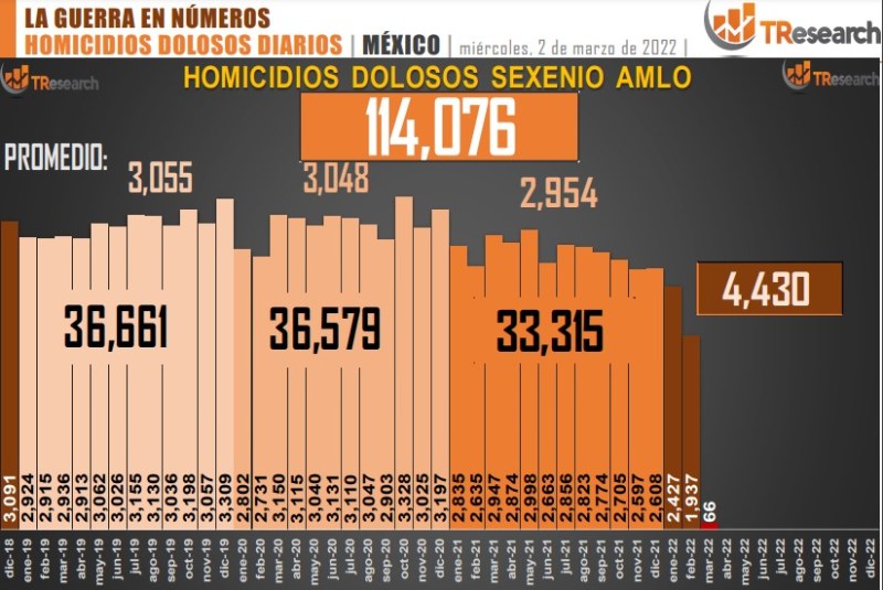El reporte ‘MX: La Guerra en Números’, de T-ResearchMX, detalla que, de acuerdo con el registro de homicidios dolosos de la Secretaría de Seguridad y Protección Ciudadana, del 1 de diciembre de 2018 al 1 de marzo de 2022, tiempo que lleva la actual Administración del presidente Andrés Manuel López Obrador, las fiscalías estatales y federales han registrado 114 mil 76 homicidios dolosos en México.