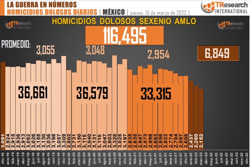 El reporte ‘MX: La Guerra en Números’, de T-ResearchMX, detalla que, de acuerdo con el registro de homicidios dolosos de la Secretaría de Seguridad y Protección Ciudadana, del 1 de diciembre de 2018 al 30 de marzo de 2022, tiempo que lleva la actual Administración del presidente Andrés Manuel López Obrador, las fiscalías estatales y federales han registrado 116 mil 495 homicidios dolosos en México.