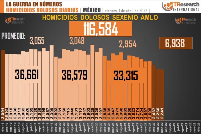 El reporte ‘MX: La Guerra en Números’, de T-ResearchMX, detalla que, de acuerdo con el registro de homicidios dolosos de la Secretaría de Seguridad y Protección Ciudadana, del 1 de diciembre de 2018 al 31 de marzo de 2022, tiempo que lleva la actual Administración del presidente Andrés Manuel López Obrador, las fiscalías estatales y federales han registrado 116 mil 584 homicidios dolosos en México.