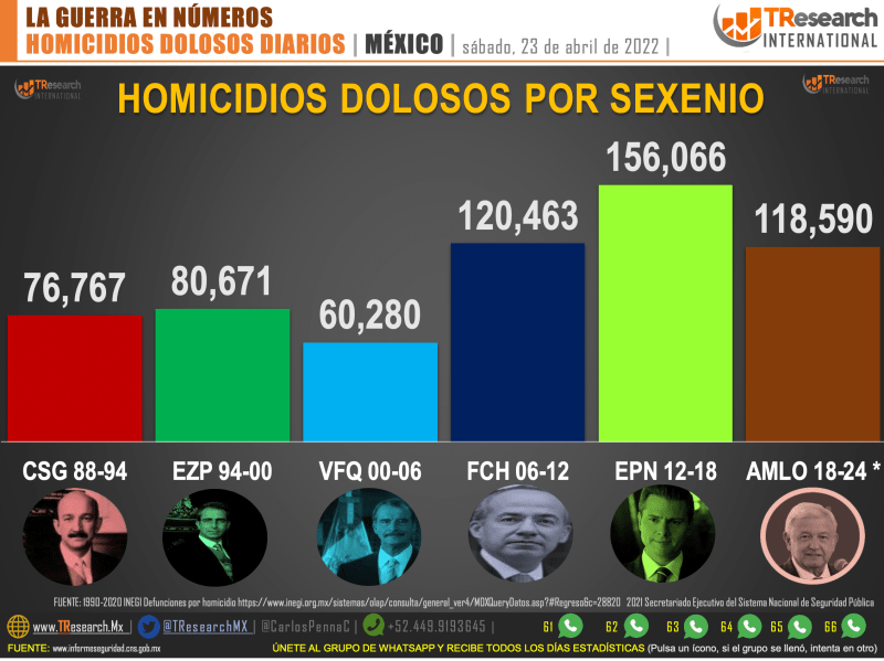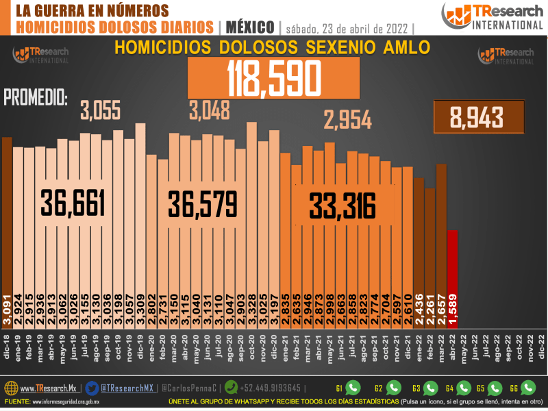 El reporte ‘MX: La Guerra en Números’, de T-ResearchMX, detalla que, de acuerdo con el registro de homicidios dolosos de la Secretaría de Seguridad y Protección Ciudadana, del 1 de diciembre de 2018 al 23 de abril de 2022, tiempo que lleva la actual Administración del presidente Andrés Manuel López Obrador, las fiscalías estatales y federales han registrado 118 mil 590 homicidios dolosos en México.