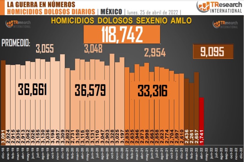 El reporte ‘MX: La Guerra en Números’, de T-ResearchMX, detalla que, de acuerdo con el registro de homicidios dolosos de la Secretaría de Seguridad y Protección Ciudadana, del 1 de diciembre de 2018 al 24 de abril de 2022, tiempo que lleva la actual Administración del presidente Andrés Manuel López Obrador, las fiscalías estatales y federales han registrado 118 mil 742 homicidios dolosos en México.