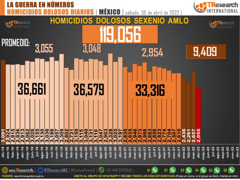 El reporte ‘MX: La Guerra en Números’, de T-ResearchMX, detalla que, de acuerdo con el registro de homicidios dolosos de la Secretaría de Seguridad y Protección Ciudadana, del 1 de diciembre de 2018 al 30 de abril de 2022, tiempo que lleva la actual Administración del presidente Andrés Manuel López Obrador, las fiscalías estatales y federales han registrado 119 mil 56 homicidios dolosos en México.