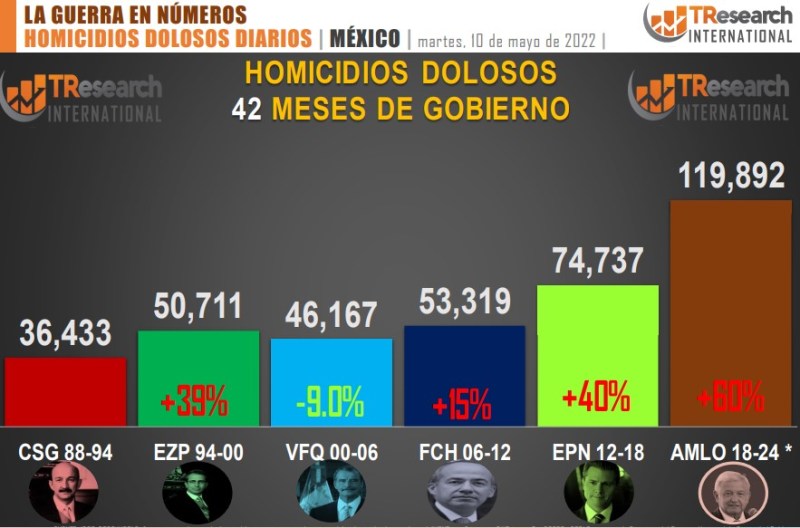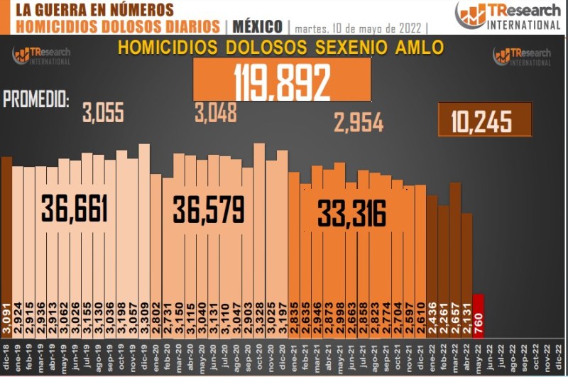 El reporte ‘MX: La Guerra en Números’, de T-ResearchMX, detalla que, de acuerdo con el registro de homicidios dolosos de la Secretaría de Seguridad y Protección Ciudadana, del 1 de diciembre de 2018 al 9 de mayo de 2022, tiempo que lleva la actual Administración del presidente Andrés Manuel López Obrador, las fiscalías estatales y federales han registrado 119 mil 892 homicidios dolosos en México.