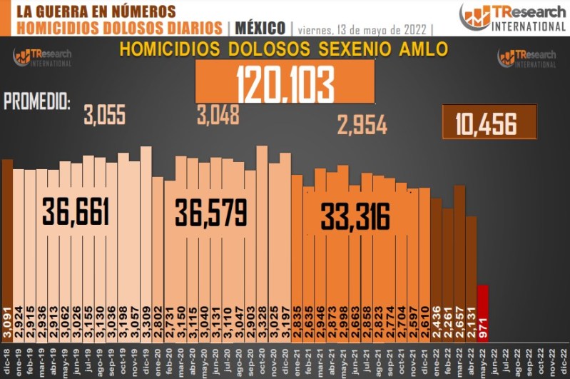 El reporte ‘MX: La Guerra en Números’, de T-ResearchMX, detalla que, de acuerdo con el registro de homicidios dolosos de la Secretaría de Seguridad y Protección Ciudadana, del 1 de diciembre de 2018 al 12 de mayo de 2022, tiempo que lleva la actual Administración del presidente Andrés Manuel López Obrador, las fiscalías estatales y federales han registrado 120 mil 103 homicidios dolosos en México.