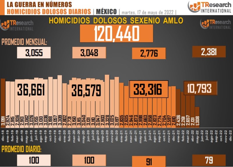 El reporte ‘MX: La Guerra en Números’, de T-ResearchMX, detalla que, de acuerdo con el registro de homicidios dolosos de la Secretaría de Seguridad y Protección Ciudadana, del 1 de diciembre de 2018 al 16 de mayo de 2022, tiempo que lleva la actual Administración del presidente Andrés Manuel López Obrador, las fiscalías estatales y federales han registrado 120 mil 440 homicidios dolosos en México.