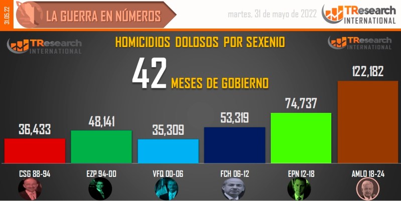 El reporte ‘MX: La Guerra en Números’, de T-ResearchMX, detalla que, de acuerdo con el registro de homicidios dolosos de la Secretaría de Seguridad y Protección Ciudadana, del 1 de diciembre de 2018 al 30 de mayo de 2022, tiempo que lleva la actual Administración del presidente Andrés Manuel López Obrador, las fiscalías estatales y federales han registrado 122 mil 182 homicidios dolosos en México.