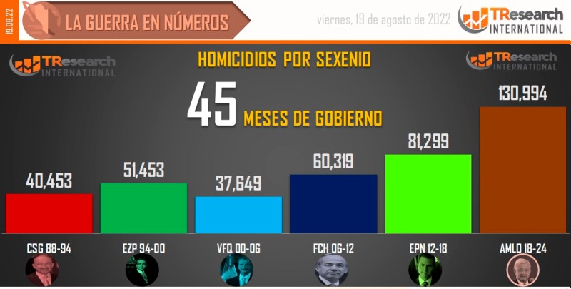 El reporte ‘MX: La Guerra en Números’, de T-ResearchMX, detalla que, de acuerdo con el registro de homicidios dolosos de la Secretaría de Seguridad y Protección Ciudadana, del 1 de diciembre de 2018 al 18 de agosto de 2022, tiempo que lleva la actual Administración del presidente Andrés Manuel López Obrador, las fiscalías estatales y federales han registrado 130 mil 994 homicidios dolosos en México.