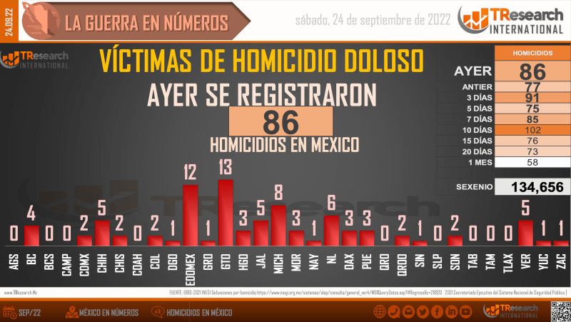 El reporte ‘MX: La Guerra en Números’, de T-ResearchMX, detalla que, de acuerdo con el registro de homicidios dolosos de la Secretaría de Seguridad y Protección Ciudadana, del 1 de diciembre de 2018 al 24 de septiembre de 2022, tiempo que lleva la actual Administración del presidente Andrés Manuel López Obrador, las fiscalías estatales y federales han registrado 134 mil 656 homicidios dolosos en México.