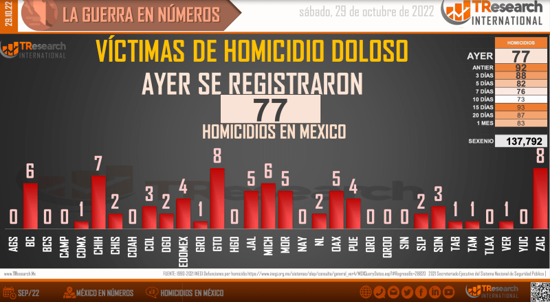 El reporte ‘MX: La Guerra en Números’, de T-ResearchMX, detalla que, de acuerdo con el registro de homicidios dolosos de la Secretaría de Seguridad y Protección Ciudadana, del 1 de diciembre de 2018 al 29 de octubre de 2022, tiempo que lleva la actual Administración del presidente Andrés Manuel López Obrador, las fiscalías estatales y federales han registrado 137 mil 792 homicidios dolosos en México.