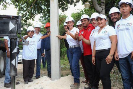 Acompañada por el delegado municipal, José Alberto Cahuich Ramírez, y el secretario de Obras y Servicios Públicos, Antonio Velázquez Betancourt, la alcaldesa caminó varias de las calles en las que ya se colocan los postes, se tienden cables y se ponen los llamados brazos que sostienen las nuevas lámparas.
