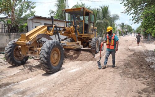Acompañada por los secretarios de Obras y Servicios Públicos, Antonio Velázquez Batencourt, y de Desarrollo Social, Ignacio Sánchez Cordero, la alcaldesa constató los trabajos de suministro y formación de base hidráulica con material de banco, que se realizan actualmente.