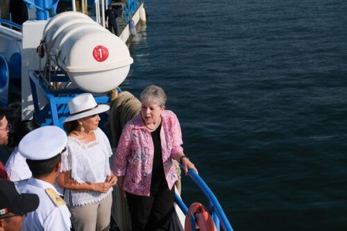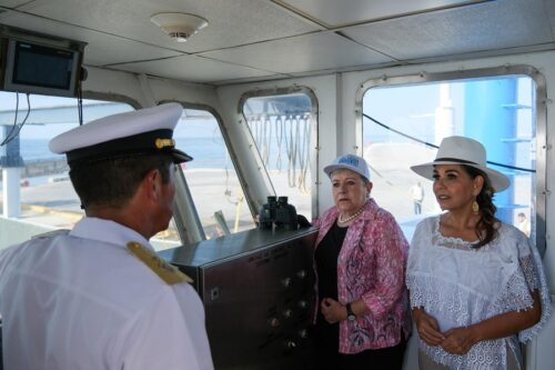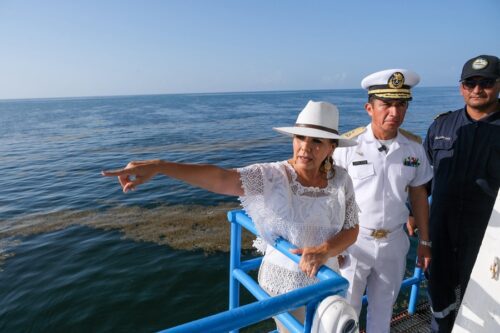 Puerto Morelos, Q. Roo.- En un recorrido de supervisión a bordo del buque sargacero Natans de la Secretaría de Marina, la gobernadora Mara Lezama Espinosa y la secretaria de Medio Ambiente y Recursos Naturales, Alicia Bárcena, destacaron el trabajo conjunto que encabezan los gobiernos de México y Quintana Roo en la contención del sargazo, un fenómeno natural derivado del cambio climático que afecta las costas del Caribe Mexicano.