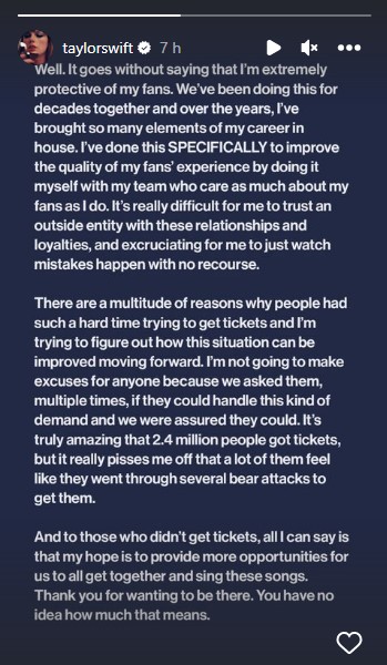 Ante el desconcierto de los seguidores de la cantante estadounidense, Ticketmaster publicó un comunicado en el que aseguró que la situación se desbordó a pesar de que para la venta de entradas de la gira de Swift se había habilitado una página especial en la que los fan debían registrarse para evitar las compras automáticas.