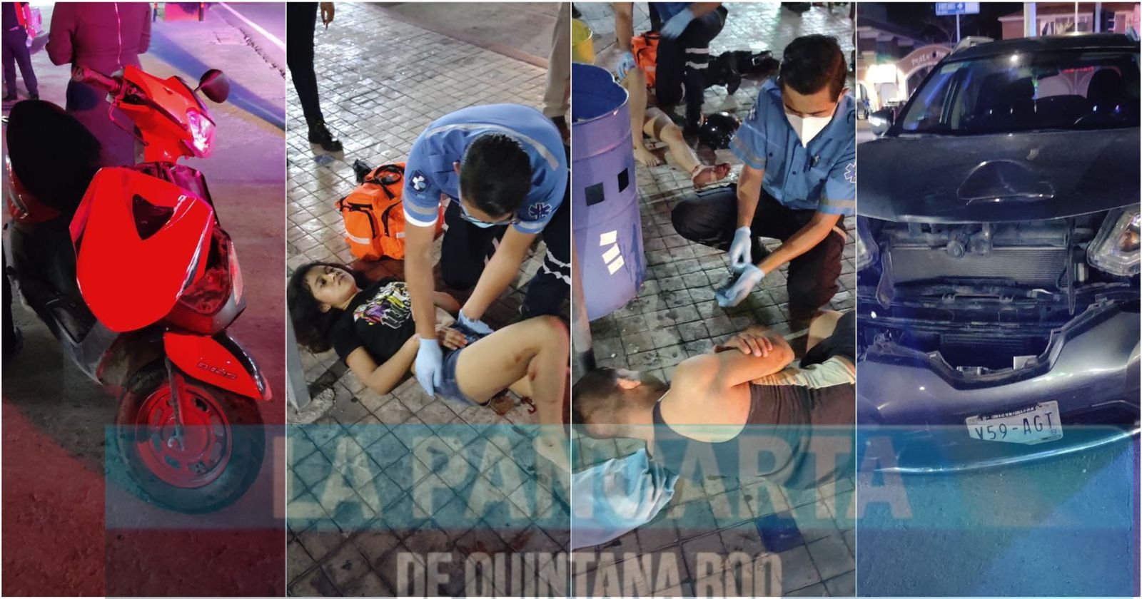 PLAYA DEL CARMEN, Quintana Roo, 24 de junio. – Tendidos sobre el pavimento acabaron dos jóvenes luego de colisionar en la noche con un vehículo particular en las inmediaciones de la colonia Centro de Playa del Carmen.