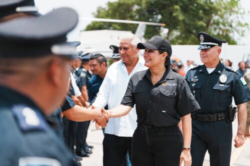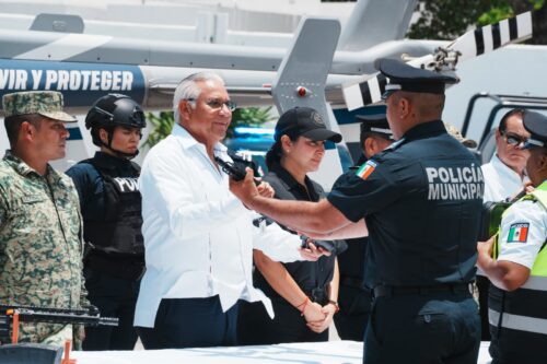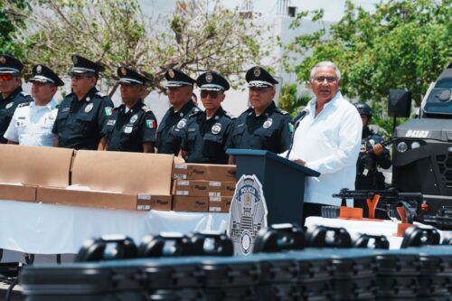 Playa del Carmen.- El titular de la Fiscalía General del Estado, Raciel López Salazar, acompañó a la Presidenta Municipal de Playa del Carmen, Estefanía Mercado Asensio, a la Ceremonia de Entrega de Armamento 2025, a la Secretaría de Seguridad Ciudadana Municipal.