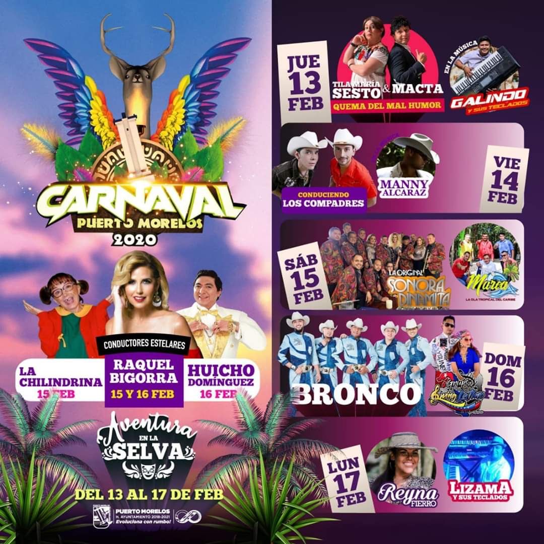 “Un día después tendrá lugar el concurso de comparsas con la presencia de Raquel Bigorra, que es una amiga de Puerto Morelos, acompañada de la ‘Chilindrina’, con la presentación estelar de la Sonora Dinamita. Para cerrar la velada subirá al escenario el grupo Marea”, informó.