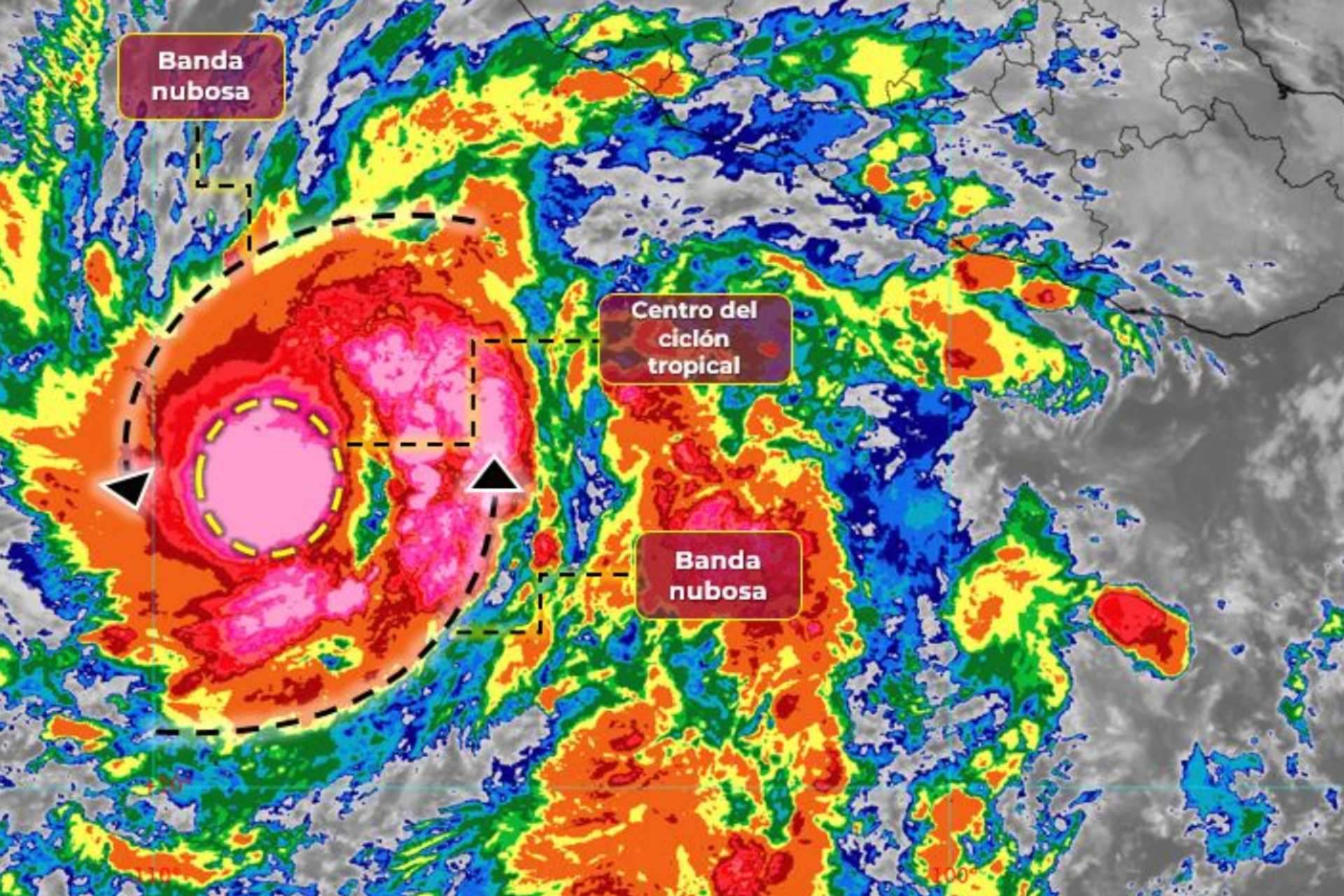 Además, registra vientos máximos sostenidos de 100 kilómetros por hora (km/h), rachas de 120 km/h y se desplaza hacia el noroeste a 17 km/h.