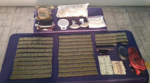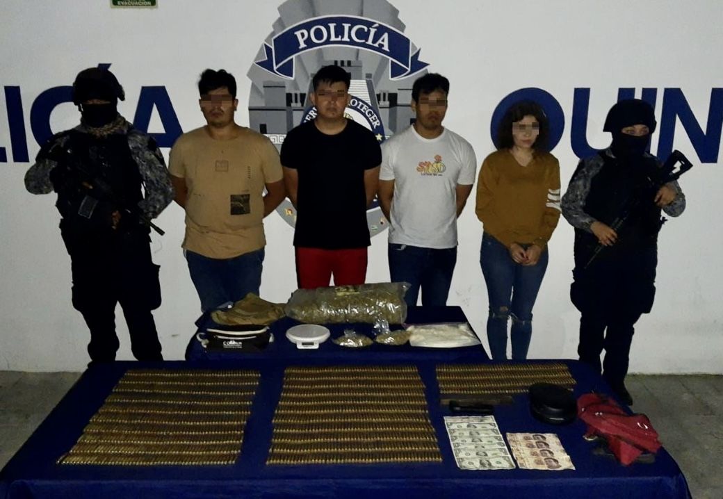 PLAYA DEL CARMEN, Quintana Roo, 25 de junio.- Elementos de la Policía Quintana Roo en coordinación con el Grupo de Operaciones Especiales (GOE), dieron duro golpe a la delincuencia en Playa del Carmen con el aseguramiento de 4 personas en posesión de mil 237 cartuchos para arma de fuego, dos bolsas y un paquete que contenían vegetal verde similar a la mariguana y una bolsa con material sólido parecido al crack, así como dinero en efectivo.