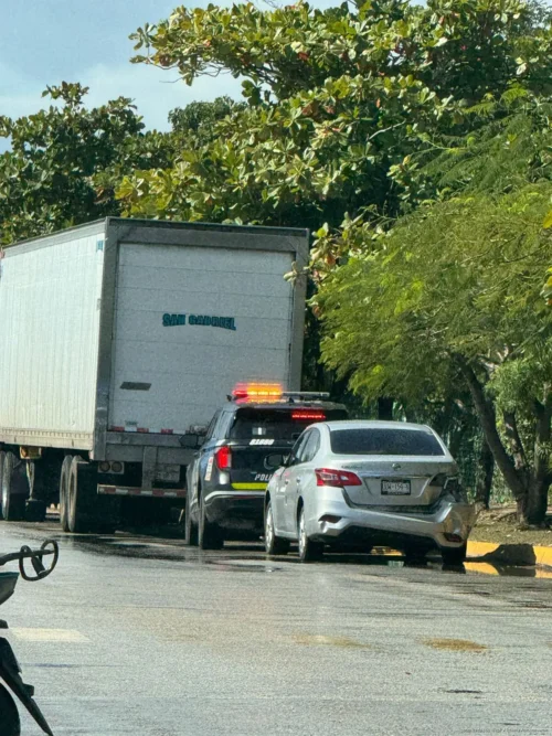 PLAYA DEL CARMEN, Quintana Roo, 27 de enero de 2026.-Un tráiler que transportaba frutas y verduras provocó un accidente vial al cambiar de carril sin la debida precaución, impactando a un vehículo particular en una de las salidas del fraccionamiento Villamar 2.