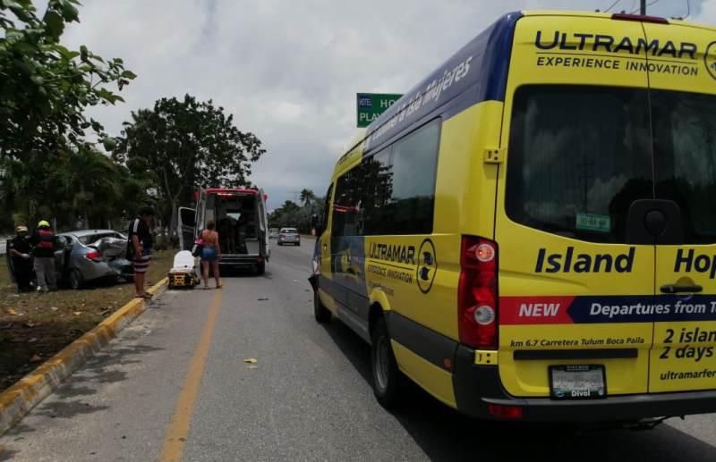 PLAYA DEL CARMEN, Quintana Roo, 1 de julio .- Una van de Ultramar que llevaba a turistas al muelle para cruzar a Cozumel se estrelló por detrás contra un automóvil particular, quedando dos personas lesionadas. Pasajeros aseguran que el chofer venía texteando por el celular y no vio al vehículo detenido adelante.