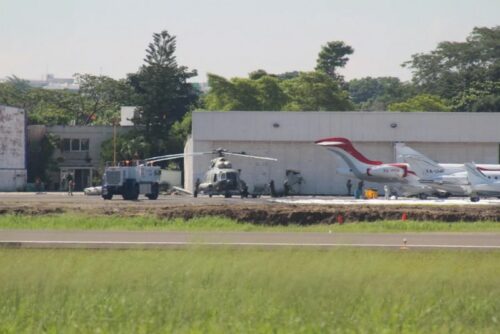 Una parte de la estructura del helicóptero de la Semar fue resguardada por elementos de seguridad privada, en la zona del estacionamiento del aeropuerto.