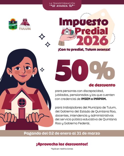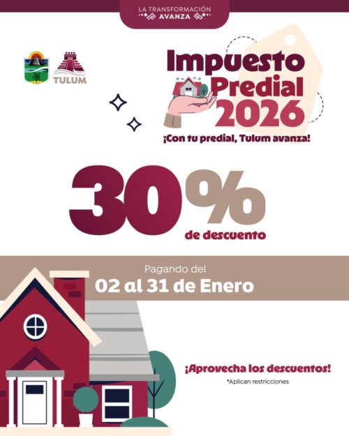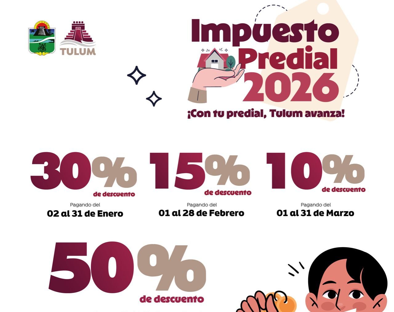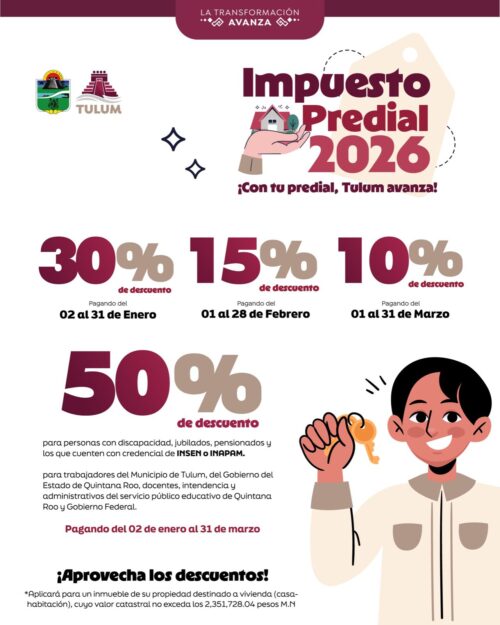 TULUM, Quintana A 02 de enero de 2026.– El ayuntamiento de Tulum inicia su campaña de descuentos “Impuesto Predial 2026, con tu predial Tulum avanza” con la cual otorga descuentos que van del 50 al 10 por ciento de descuento para quienes paguen en los primeros tres meses del año, como una forma de incentivar su responsabilidad y disciplina fiscal.