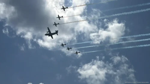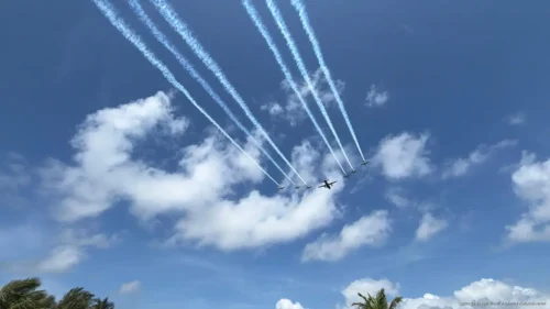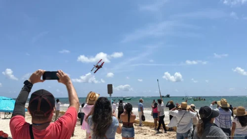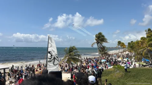 Desde el jueves, aeronaves militares y civiles realizaron exhibiciones de acrobacia aérea en el Aeropuerto Internacional de Tulum y zonas costeras, con maniobras como vuelos en formación, giros y vuelos invertidos.