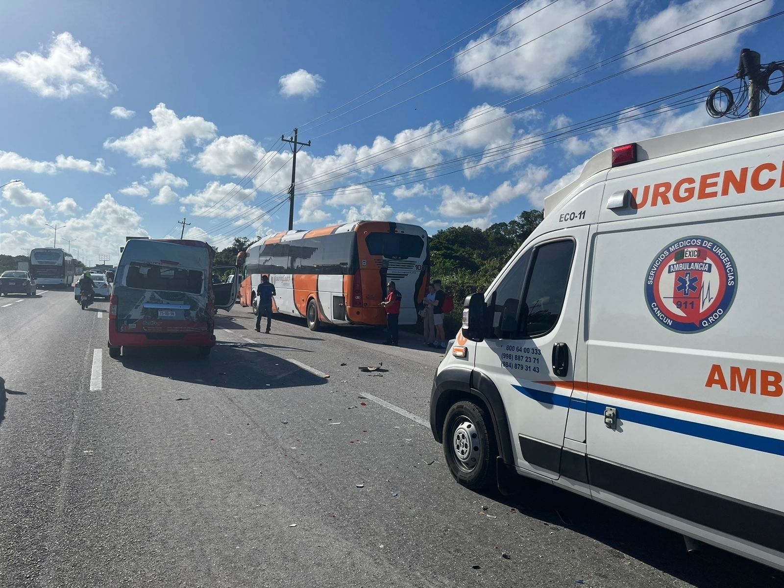 PLAYA DEL CARMEN, Quintana Roo, 06 de enero. – Aparatoso accidente de tránsito en tramo federal a la altura de Punta Maroma entre un autobús y una van, ambos de servicios turísticos, dejó como saldo cinco personas heridas y cuantiosas pérdidas materiales.