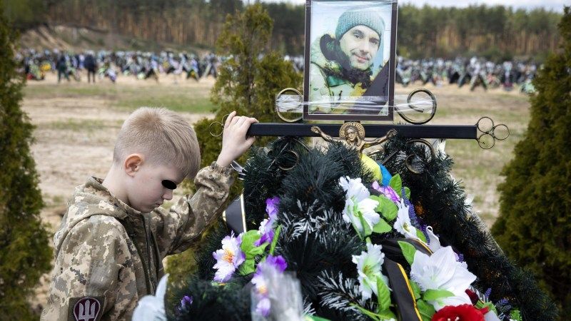 Tarash tenía 43 años y era coronel de las Fuerzas Armadas Ucranianas. Su padre, de 71 años, llora junto a su tumba y dice que solo su propia muerte podrá aliviarle el dolor.