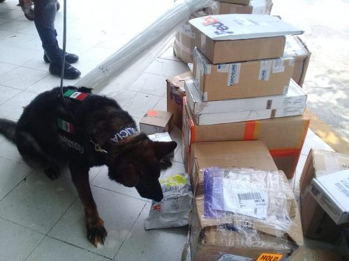 PLAYA DEL CARMEN, Quintana Roo, 28 de abril .-En la lucha frontal contra la delincuencia, la Secretaría de Seguridad Pública y Tránsito de Solidaridad que dirige el comandante Jorge Robles Aguilar, a través de la Unidad Canina continúa con los operativos para detectar narcóticos, armas de fuego, artefactos explosivos y papel moneda, en este sentido del 20 al 25 de abril se realizaron 5 puestas a disposición del Ministerio Público por delitos contra salud de un total de 10 paquetes asegurados en un empresa de paquetería ubicada en la colonia centro.
