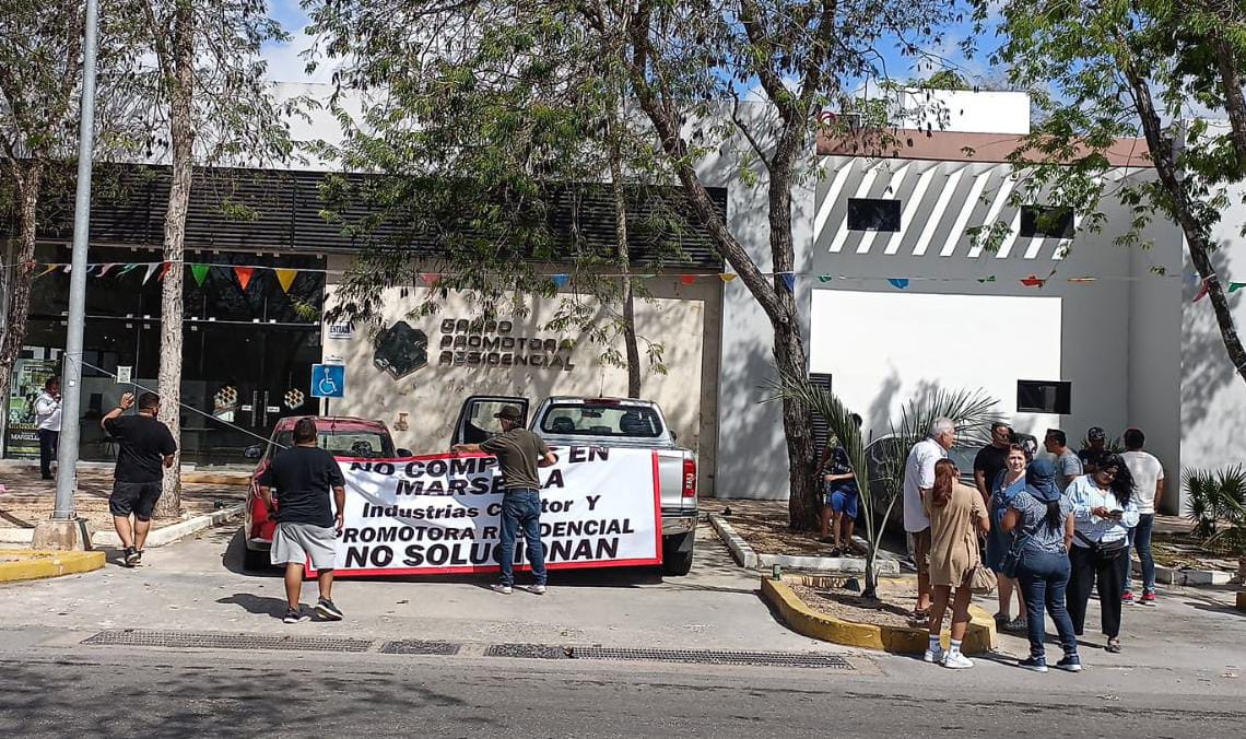 Playa del Carmen, Q. Roo.— La mañana de este jueves, vecinos del fraccionamiento Marsella se manifestaron frente a la oficina de ventas de la desarrolladora Grupo Promotora Residencial, en protesta por el incumplimiento en la entrega de los espacios públicos prometidos al momento de adquirir sus viviendas.
