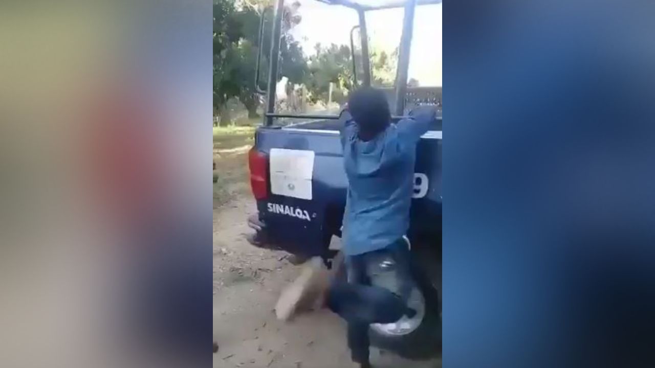 Un policía de Escuinapa, Sinaloa, fue grabado mientras golpeaba con una tabla a un hombre esposado a una patrulla.
