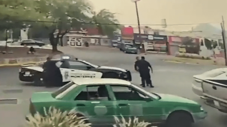 En las imágenes, se observa a los cinco elementos descender de un vehículo oficial y comenzar a pelear en las inmediaciones de una tienda Oxxo en el mencionado lugar.