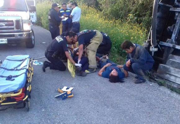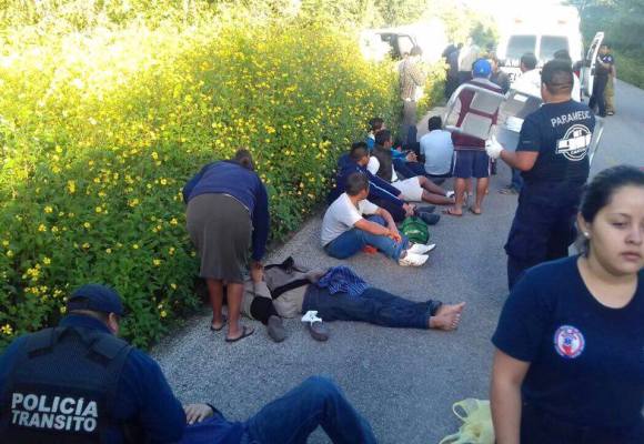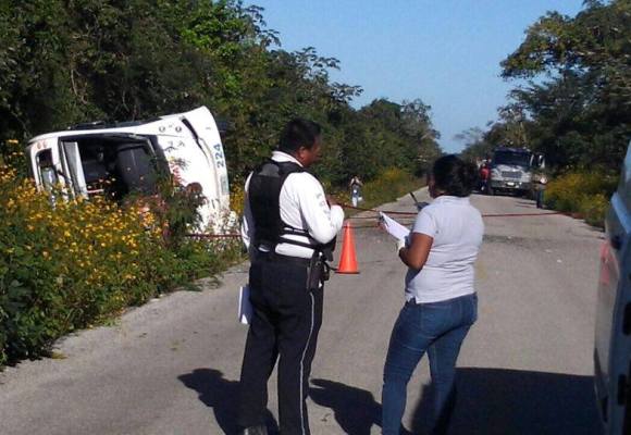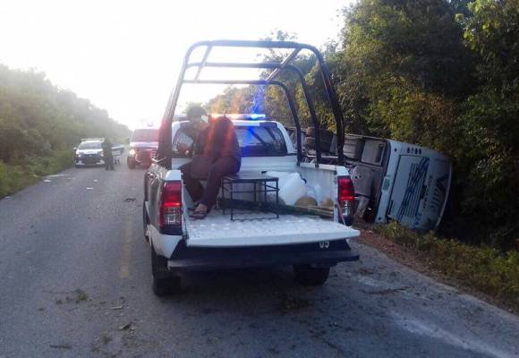 PUERTO MORELOS, Quintana Roo, a 26 de enero.- El día de hoy, una persona de sexo femenino pierde la vida y 19 más resultan lesionados, al volcarse un autobús de la empresa de Valle que transportaba personal del hotel Vidanta. Hechos que ocurrieron en el kilómetro 06 de la carretera de la ruta de los cenotes, cerca de la Delegación de Leona Vicario, dicha empresa se encuentra ubicada en el ejido de Alfredo V. Bonfil.