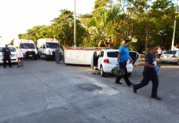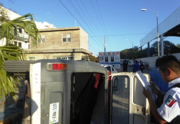 PLAYA DEL CARMEN, Quintana Roo, 18 de abril.- Una mujer y un menor de edad resultaron lesionados, al verse involucrados en una aparatosa volcadura sobre la avenida 130 con calle 3 sur de la colonia bellavista, entre una combi particular y un auto compacto.