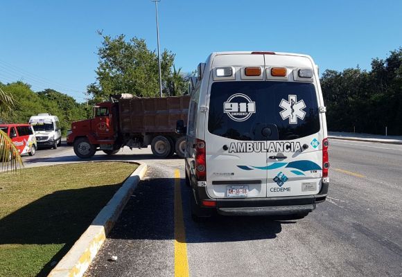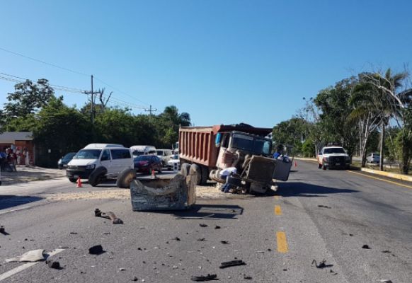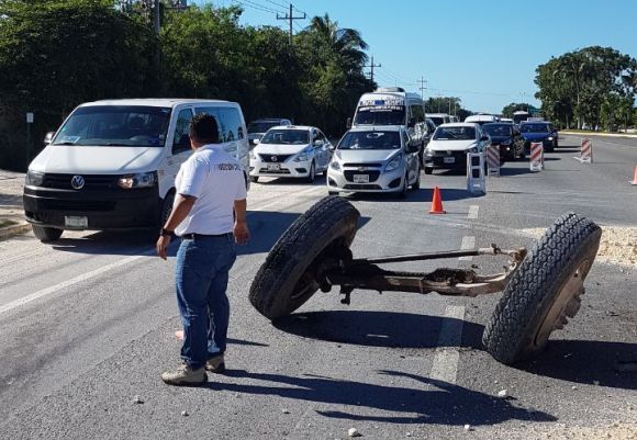 PLAYA DEL CARMEN Quintan Roo, a 27 de noviembre.- La mañana de este lunes se registró un aparatoso accidente sobre la carretera federal Cancún – Playa del Carmen a la altura del Kilometro 48. El eje delantero de un camión volquete se desprendió impactando a un automóvil Nissan Tiida, una persona resultó lesionada.