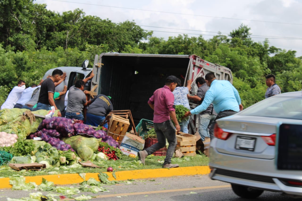 PLAYA DEL CARMEN, Quintana Roo, 16 de septiembre. – Al reventarse una de las llantas traseras de una camioneta que iba sobre la Carretera Federal 307, a la altura del Hotel Barceló, cargada con frutas y verduras provocó que su chofer perdiera el control y se volcara quedando en el carril izquierdo de esta vía.