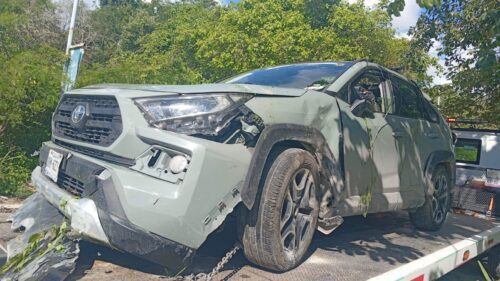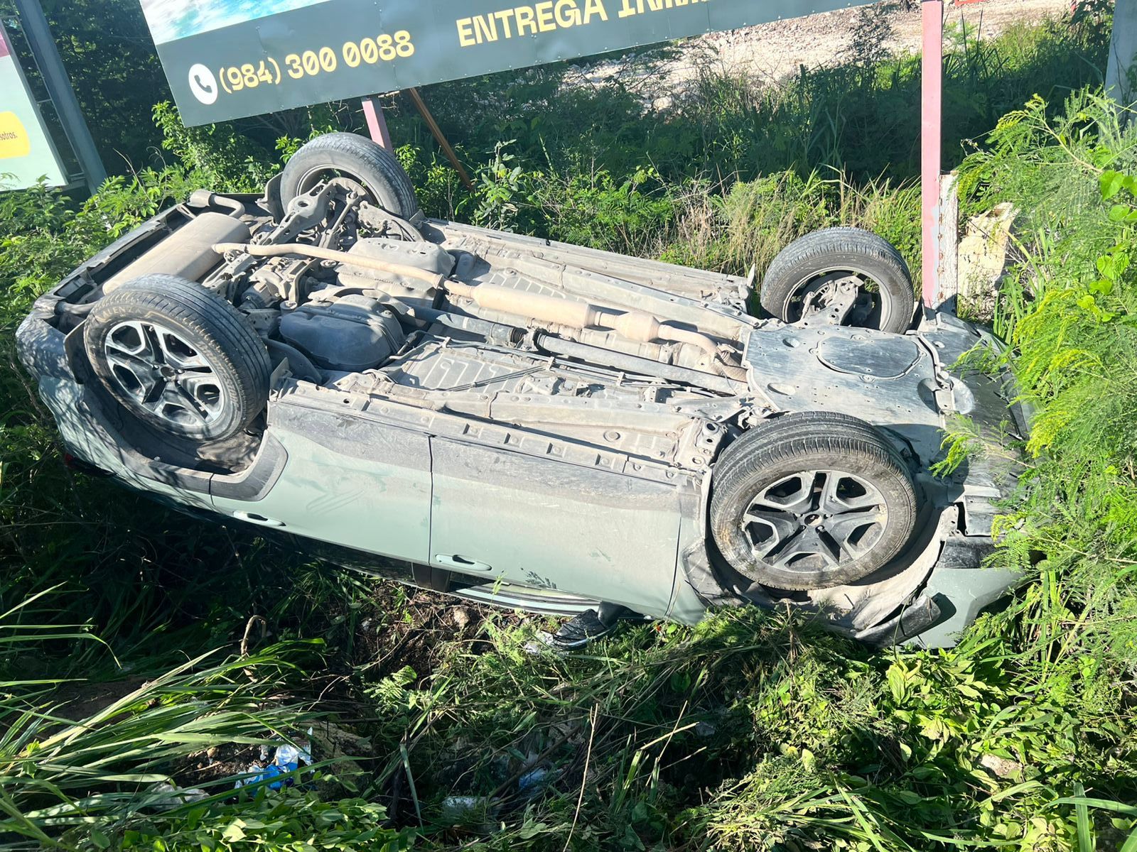 Playa del Carmen, Q. Roo, 29 de septiembre de 2025.– Una camioneta Toyota RAV4 color verde terminó volcada la mañana de este lunes, a la altura del fraccionamiento Bali, luego de que su conductor perdiera el control de la unidad.