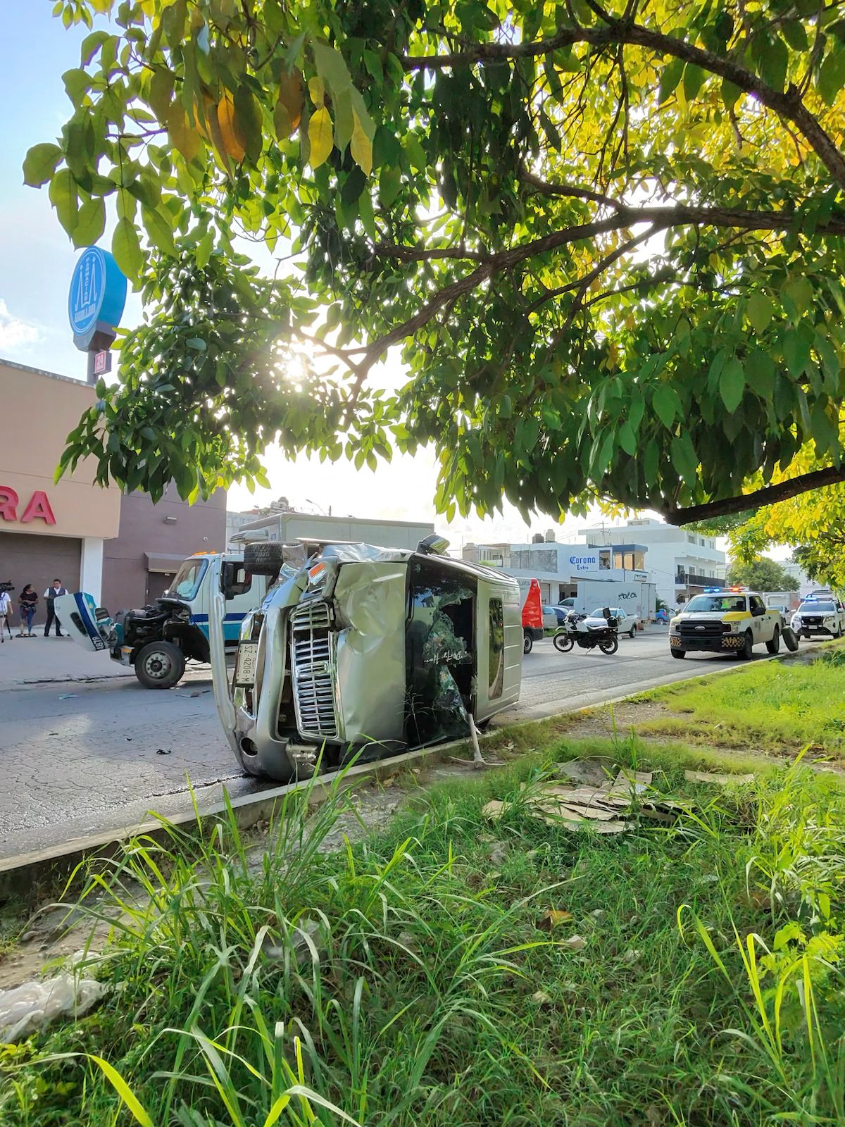 Vuelca camioneta tras chocar con camión repartidor en cruce de avenidas en Cancún