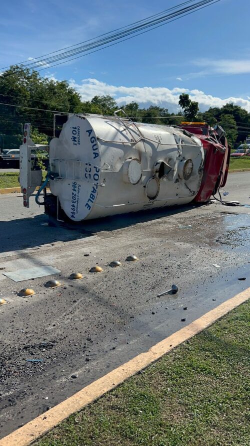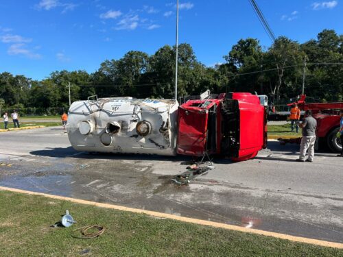 PLAYA DEL CARMEN, Quintana Roo, 2 de enero de 2026.— Una pipa cargada con agua volcó la tarde de este jueves sobre el bulevar Playa del Carmen, luego de que su conductor perdiera el control de la unidad presuntamente a causa de una falla mecánica. A pesar de lo aparatoso del accidente, el chofer resultó ileso.